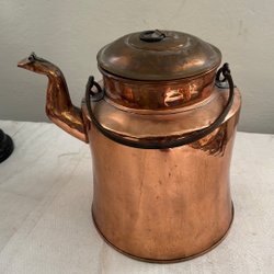 Kopparkanna med handtag och tre ben. Kannan har ett avtagbart lock. Jag har ej gjort rent den för jag har inte medel till sånt sen vill jag inte förstöra den!