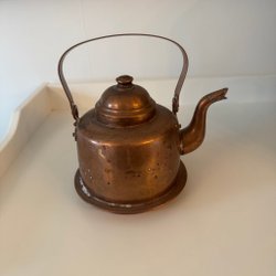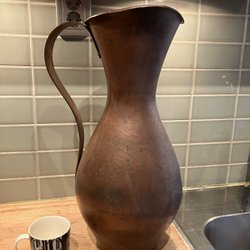 Kopparkanna med hamrad yta. Kannan har ett handtag och en pip.