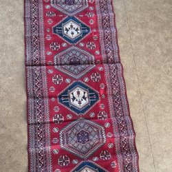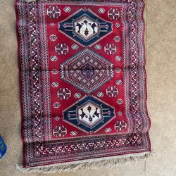 Äkta orientalisk matta, blå/beige blommönster med bård och fransar.
