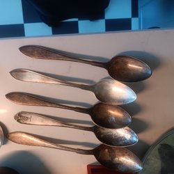 Säljer ett set med bestick i silver. Setet innehåller 5 skedar och 3 gafflar.