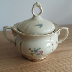 Kaffeservis med kaffekanna, gräddkanna och sockerskål. Servisen är graverad: "Till minne af Hans och Kjerstin Bengtsson på Guldbröllopsdagen 22/8 1890". Har gått i arv 1968, årtalet inristat under kannan. Sockerskålen har en buckla på ena sidan, se bild.