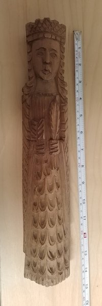 En vacker träskulptur föreställande en kvinna med krona. Skulpturen är cirka 40 cm lång.