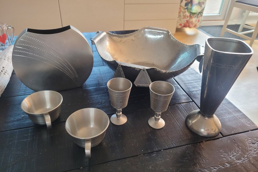 Ett set med tennföremål, inklusive en vas, en skål, två bägare och två muggar. Föremålen har dekorativa mönster.