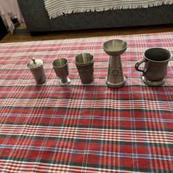 Ett par bägare i tenn. Märkta "TENN HANDARB. LGS I 10" undertill. Ca 5 cm höga.