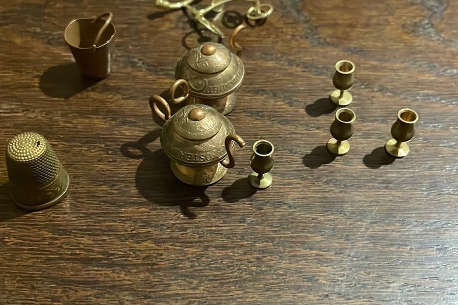 Diverse miniatyrer i mässing. Inkluderar bland annat tekannor, hink, fingerborg och ljusstakar.