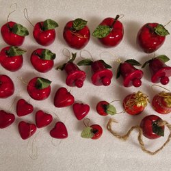 Dekorativa klockor för julgranen. De är i olika färger och har röda band.