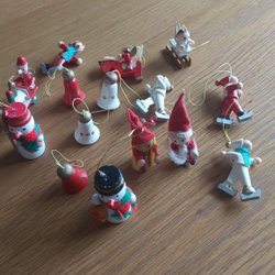 Ett set med julgranspynt i trä. Inkluderar en häst, en släde, en måne, en stjärna, en klocka och en julgran.