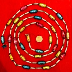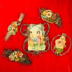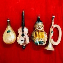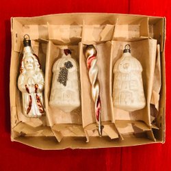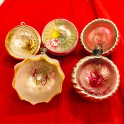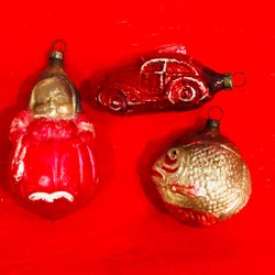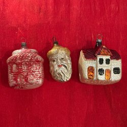 Två antika julgransdekorationer. Den ena av glas, den andra av något slags konstmaterial. Båda har lindats / dekorerats med tunn ståltråd och glaskulan har dessutom ett par silverfärgade blad av papper, ”Dresdener pappe” dvs exklusivt präglat papper av mycket hög kvalitet. Sannolikt minst 100 år gamla. Åldersrelaterat slitage, men ändå mycket gott skick med tanke på åldern. Se bilder för storlek och skick. Jag samfraktar gärna om du vinner fler auktioner. Maila mig om du har frågor eller funderingar.