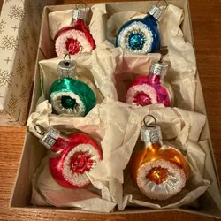 Alla julgransprydnader är gjorda av glas, förutom de tre röda och fyra gula raderna i den översta raden, som också är i retrostil. Obs: Vissa av julgransprydnaderna har en krok, medan andra i videon tyvärr saknar en näbbdel.