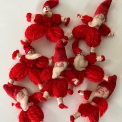 Fem mycket gamla smällkarameller i olika vackra färger och med fin patina. Dekorationer av guldpapper samt bokmärke. Flera av dem skramlar och har alltså sitt okända innehåll kvar.
