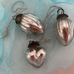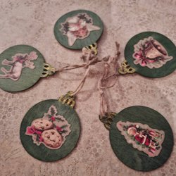 6 st. julgranshängen i metall med en plastpärla, höjd ca 4 till 6 cm, 1 st. hjärta, 1 st. snöflinga, 1 st. julgran, 1 st. hjort, 1 st. snögubbe, 1 st. änglavingar, titta noga på bilderna innan bud