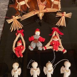 Ett set med julgranspynt innehållande två julgranskulor, två julbockar i halm och en ängel.