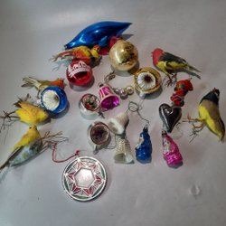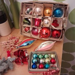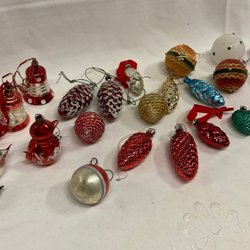 Ett set med vintage julgranspynt. Inkluderar figurer som tomtar, snögubbar och änglar i rött och vitt. Perfekt för att skapa en traditionell julstämning.
