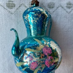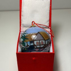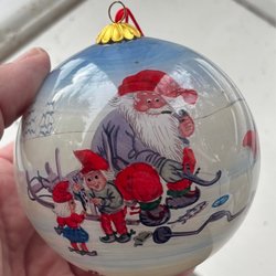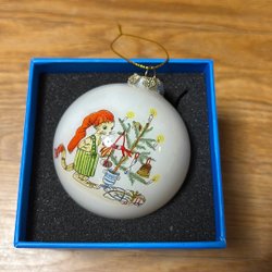 En julgranskula för julgranen. Den är vit med silverfärgade detaljer.