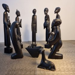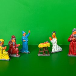 En vacker julkrubba med figurer av Maria, Josef, Jesusbarnet och några får. Krubban är gjord av trä och har ett rustikt utseende.