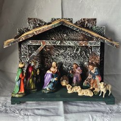 En klassisk julkrubba med handmålade figurer. Inkluderar Jesusbarnet, Maria, Josef, de tre vise männen, åsna, oxe och får. Tillverkad i Tyskland.