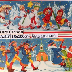 AE0004. Grannt tryck! Lars Carlson (1921-2002) Format: ca 18x100 cm. Oanvänd. Äkta 1950-tal, då trycket var som bäst: skarp tydlighet, och kanske fler än dagens 4 färger. Denna var Axel Eliassons förlags fjärde fris, "04". Hos AE har friser, bonader, dukar, löpare respektive vepor (lodräta), var sin nummerserie från 1, vilket krånglar till varje samlares registrering.