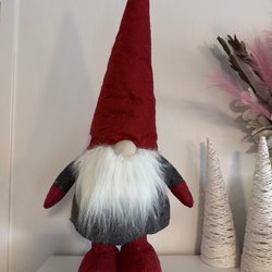 Söt jul tomte med röd luva och halsduk. Grå kappa med stjärna och röda knappar. Höjd ca 37 cm.