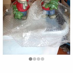 Två charmiga äldre trädgårdstomtar. Den ena tomten håller en lykta och den andra bär på en söt liten gris. Vet tyvärr inte material och hur gamla de är.