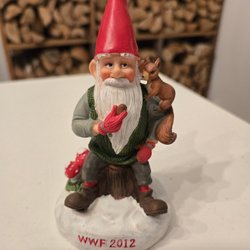 En charmig WWF tomte från 2012, designad av Eva Dahlberg. Tomten sitter på en stubbe med en ekorre på axeln och håller en nöt i handen. Perfekt för samlare eller som en söt juldekoration.