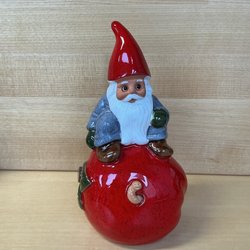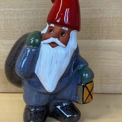 En charmig trädgårdstomte med röd luva, grön jacka och röda byxor. 22 cm hög, 9 cm bred. I mycket fint skick.