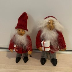 Ett set med två handgjorda och mycket fina jultomtar. Den ena tomten har en röd stickad luva och den andra har en vit hårkrans. Båda tomtarna bär på små paket och har detaljerade ansikten och kläder. Perfekta för att sprida julstämning i hemmet. Fått dessa i present, inköpta från en hantverksaffär i Värmland. Helt nya.