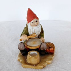 En mycket söt och charmig tomte i porslin efter förebild av Jenny Nyström, Kalmar Läns Museum. Tomten sitter och stoppar strumpor med en sax bredvid sig.