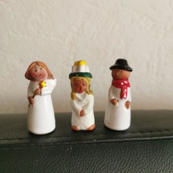 Två söta figurer i form av små tomtar. Den ena bär en trästam och den andra bär en bricka med kakor hjärtan och Stjärnor. Ca 11,5 cm hög. Kolla på andra mina annonser, samfraktar gärna.