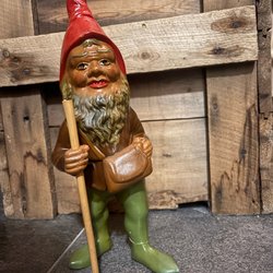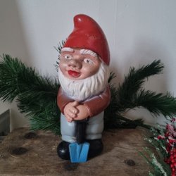 En klassisk trädgårdstomte med pipa. Denna tomte har en grön mössa och jacka, röda byxor och svarta skor. Han står med en käpp i handen.