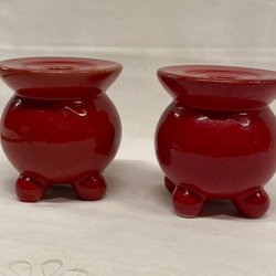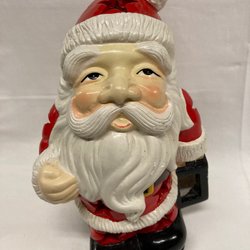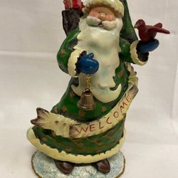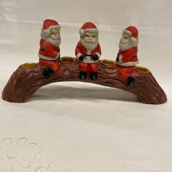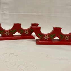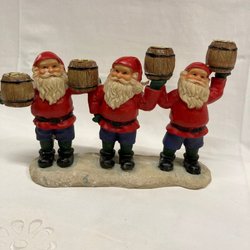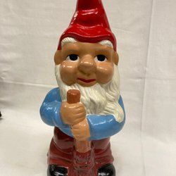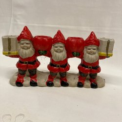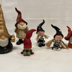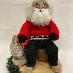 Dekorativ välgjord tomte med röd luva och grått stickat tyg på trästomme. 28 cm hög. Felfri.