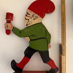 En äldre tomtefigur i keramik. Tomten har en röd luva, grön tröja och röda byxor. Han håller ett ljus i ena handen och en pipa i den andra. Perfekt som juldekoration.