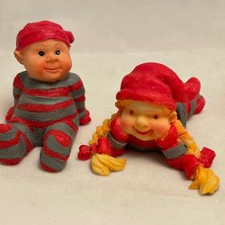 En söt äldre tomte figur med röd luva, jacka och gröna byxor. Han står på en liten platta.