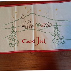 Handbroderad julbonad. Sydd på vävtyg.