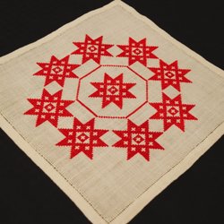 En trevlig handbroderad julduk med fint mönster i vitt på röd aida.