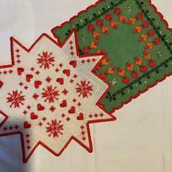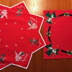 Två julservetter med röda kanter, bjällror och fåglar.