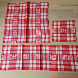 Röd julduk med broderade julmotiv. Perfekt för att skapa julstämning i hemmet.