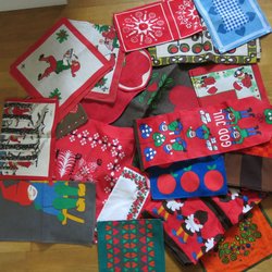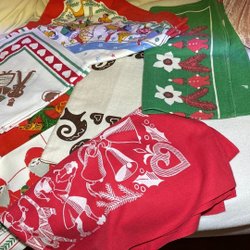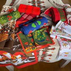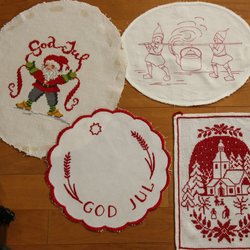 Diverse jultextilier med julmotiv.