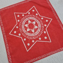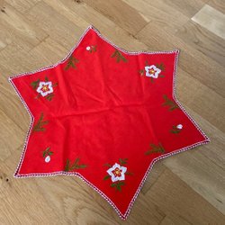 En julstjärna-formad duk med broderade julmotiv. Perfekt för att sprida julstämning i hemmet. 18 cm från spets till spets.