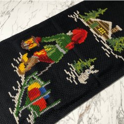 En söt julduk med broderade tomtar och julmotiv. Perfekt för att sprida julstämning i hemmet.