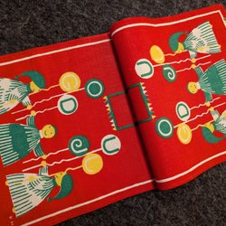 Tomtarna spelar instrument, bär klappar och granar, medan stjärnor och mistelgrenar pryder bakgrunden. En underbart färgstark duk som skapar genuin julglädje i klassisk 1950–60-talsstil. Röd botten med blå, gröna och gula detaljer. OK/fint skick- finns några anmärkningar i form av fläckar - se bilder.