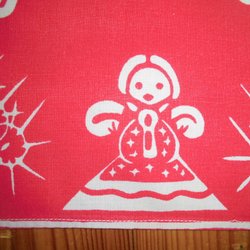 En klassisk fin mellanstor julduk med tryck med HJÄRTAN, TOMTAR, lingonris med lingon och röd kantbård på en vätvävd svagt krämvit bomull. Trycket och motivet är klart och fint i färgerna och är typiskt klassiska tomtar och hjärtan. Svårt att datera duken som är tidlös och stilren som julduk. En julduk som kommer att kännas rätt i många år och som är i jättefint beg skick.