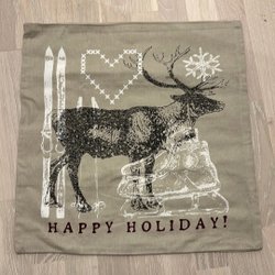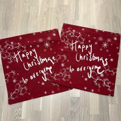 Två kuddfodral med olika Rudolf motiv. Ena sidan har en bild på en ren och den andra har texten till Rudolf med röda mulen. Ca 42 x 48 cm.