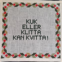 Storlek själva bonaden ca 19cm ×47 cm. Upphängning i rött band är utöver dessa mått. Bomullsgarn på aidaväv. Ok begagnat skick. Finns en skada på träupphängningen. Se bild. Studera bilder noga och lägg bara bud om du fullföljer köpet.