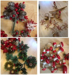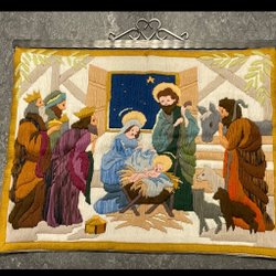 En äldre julduk med ett charmigt motiv av tomtar runt granar. Perfekt för att skapa en mysig julstämning.