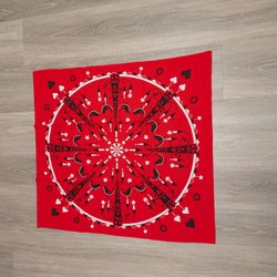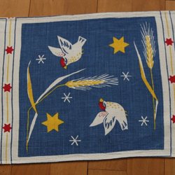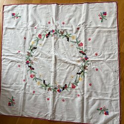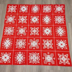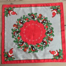 En festlig julduk med ett vackert tryck av fåglar, blommor och julmotiv. Perfekt för att skapa en härlig julstämning i hemmet.