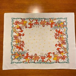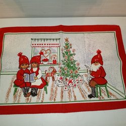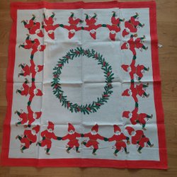 Julduk med ett motiv av tomtar, ljus och julgran.