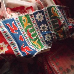tryck på strukturväv huvudsakligen bomull tror vi. Måtten är omkring cirka 8 x 9 dm
