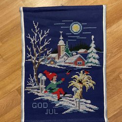 En broderad Julduk med tomtar.