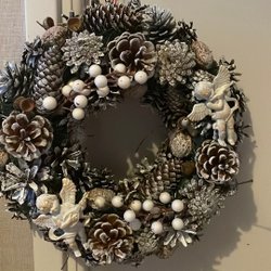 Dekorativ julkrans med detaljer i guld och rött. Inkluderar extra dekorationer.