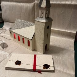 En julkyrka med speldosa och elektrisk belysning. Den levereras i originalkartongen. Drivs med sladd.